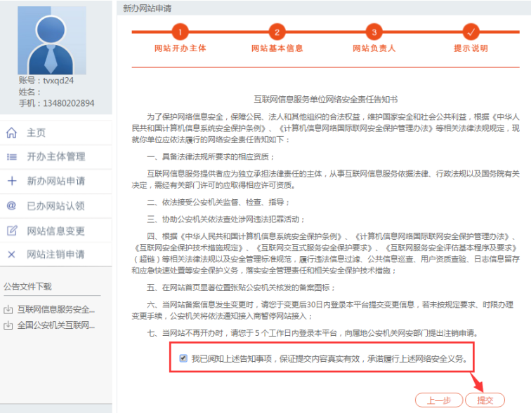认真阅读《互联网信息服务单位网络安全责任告知书》后,打钩,点击提交。